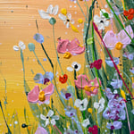 A warm peachy morning filled with wildflowers, soft light, distant fields and tiny sheep wandering through the meadow.