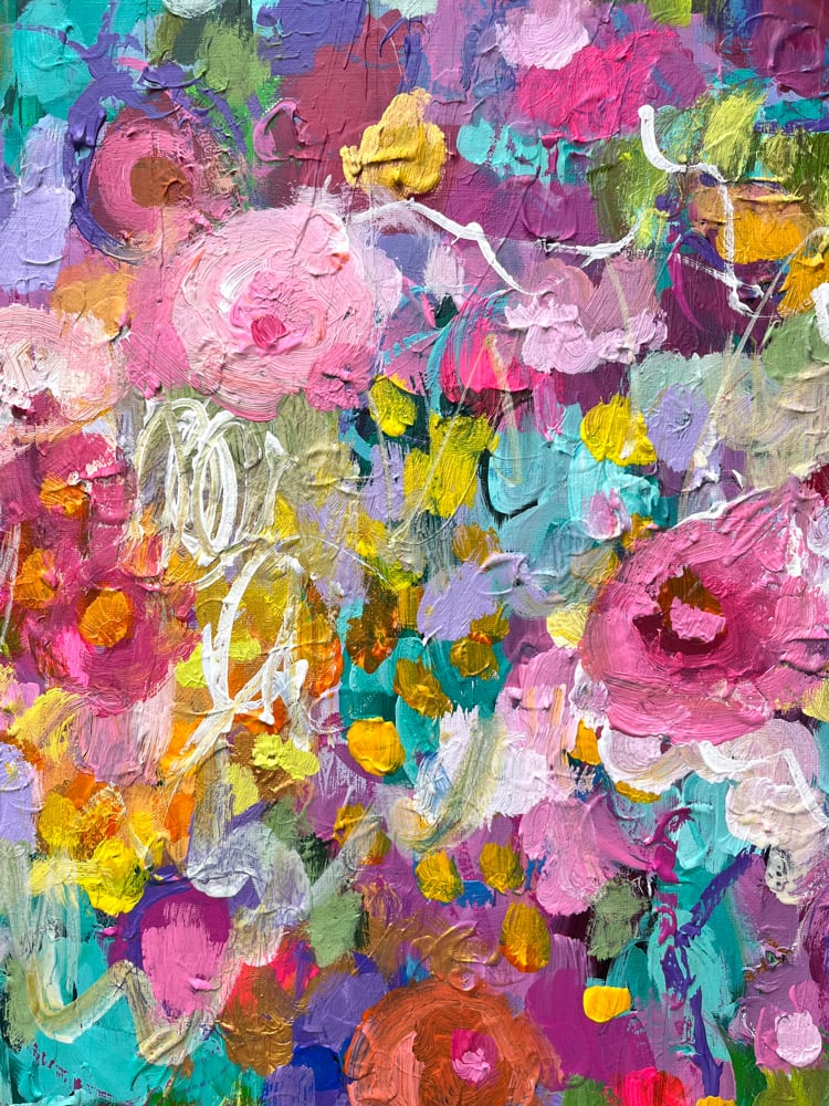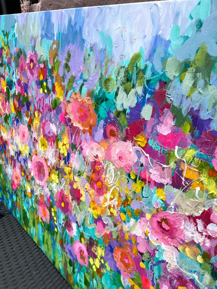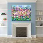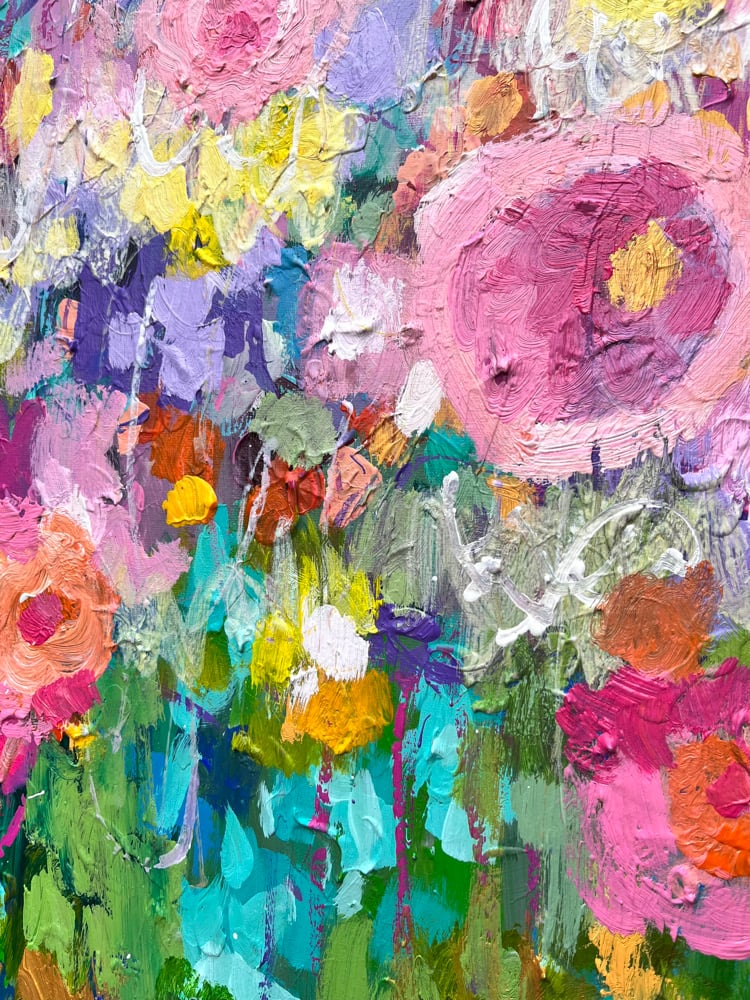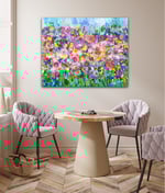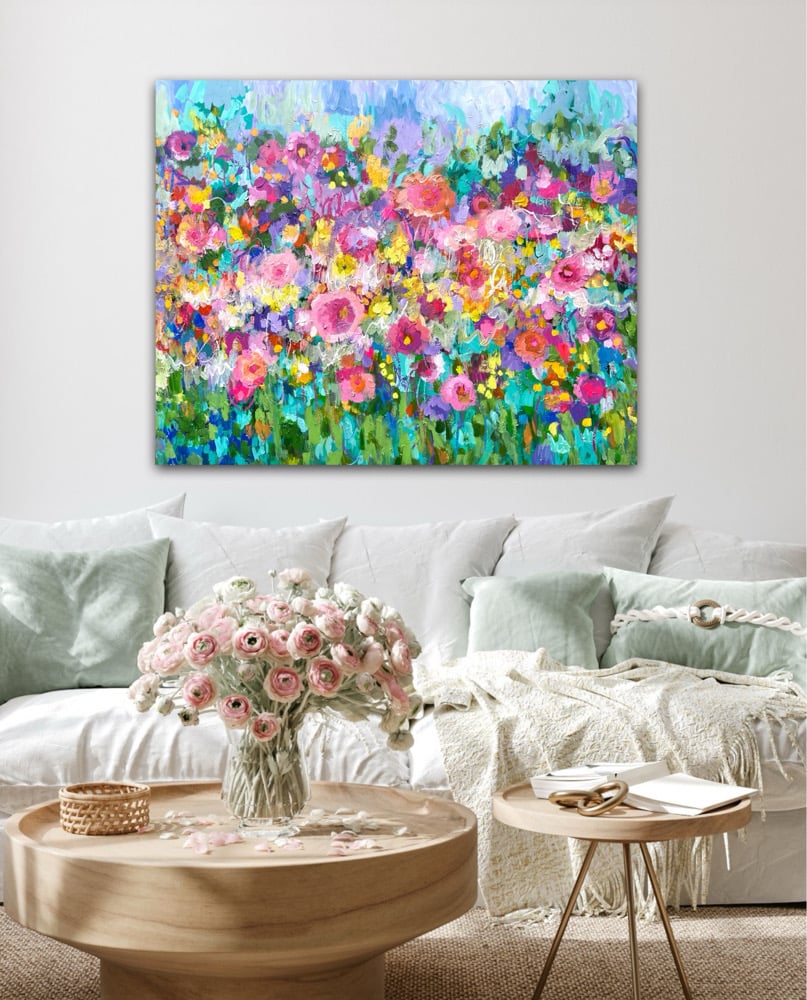 A large abstract floral painting, bringing a burst of colour and wild blooms into your room in any season of the year.
