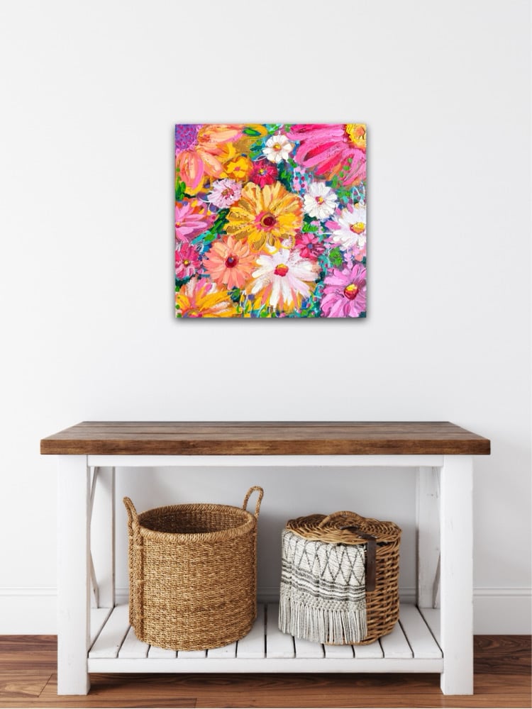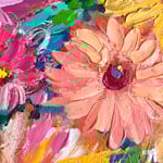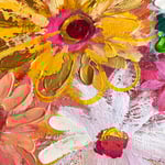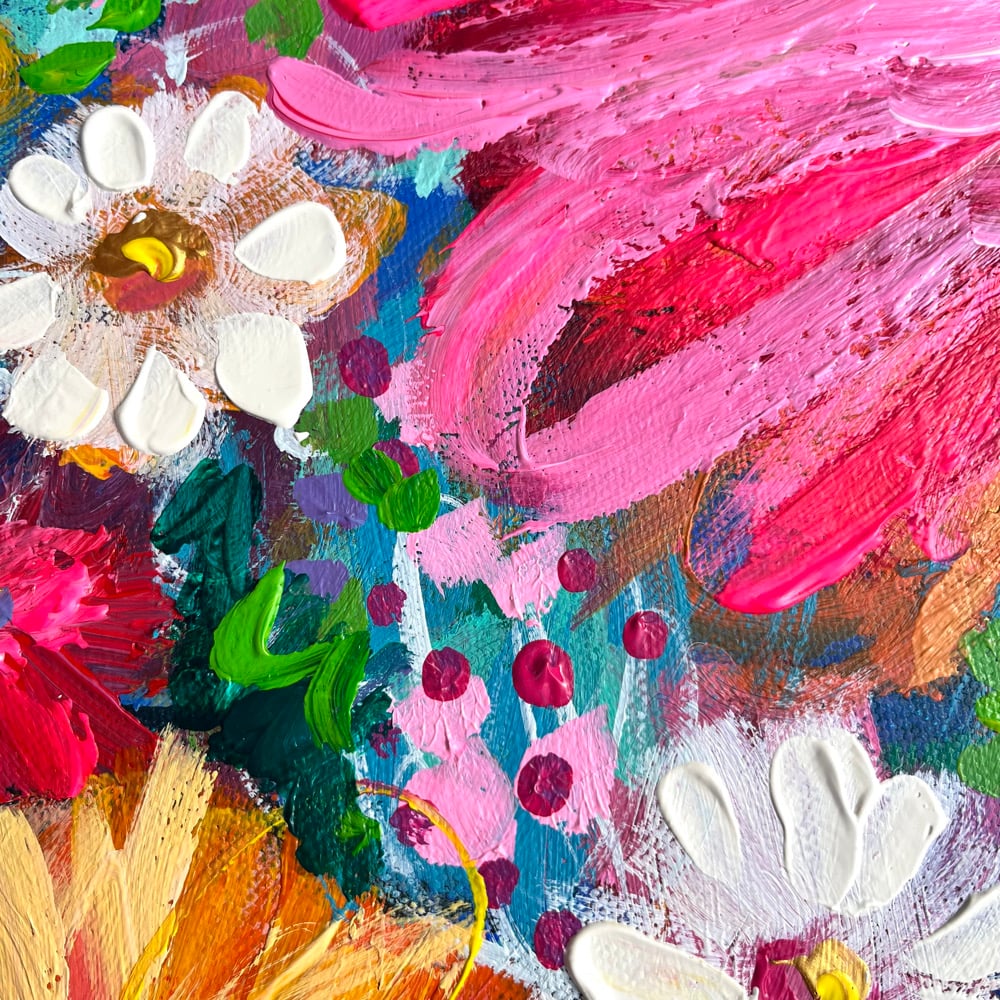 A bright, abstract floral painting, bringing a gorgeous burst of colour and wild blooms into your room in any season of the year.